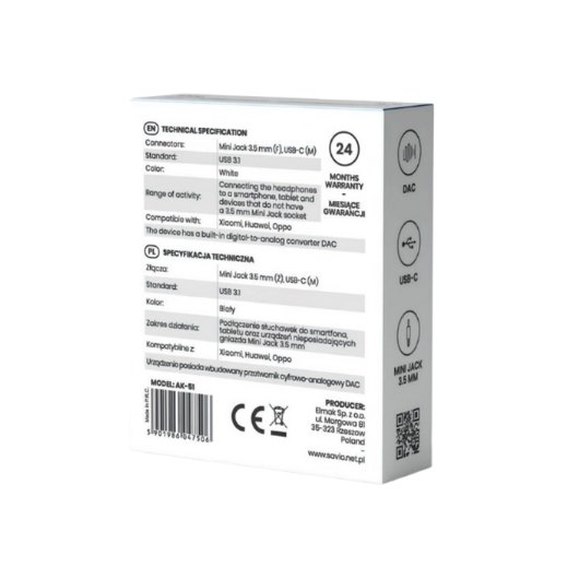 ADAPTADOR USB-C SAVIO AK-51 BLANCO DAC USB TIPO C MINI JACK 3,5 MM